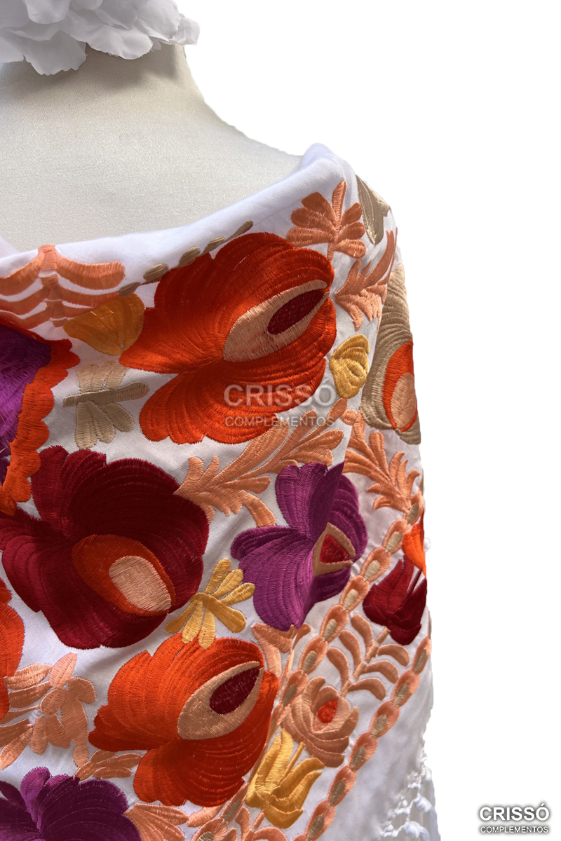 Mantón de seda bordado en hilo de algodón con motivos florales. Flecado a mano en seda.