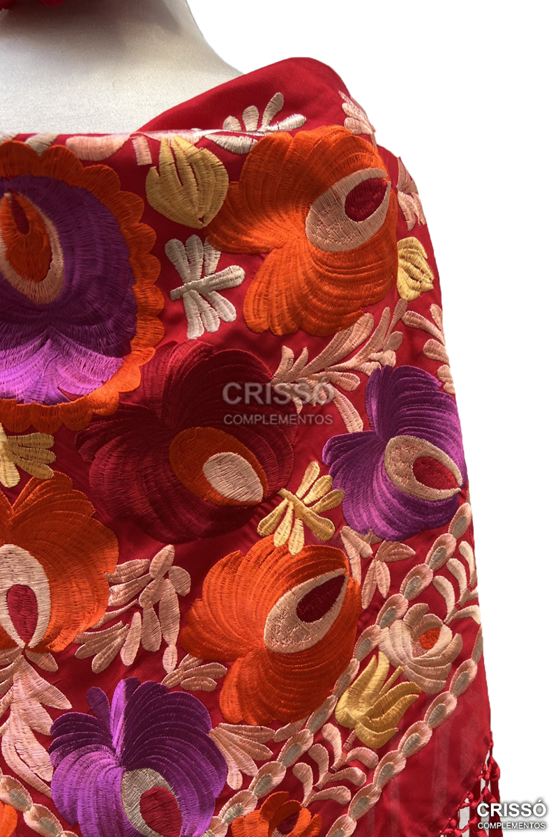 Mantón de seda bordado en hilo de algodón con motivos florales. Flecado a mano en seda.
