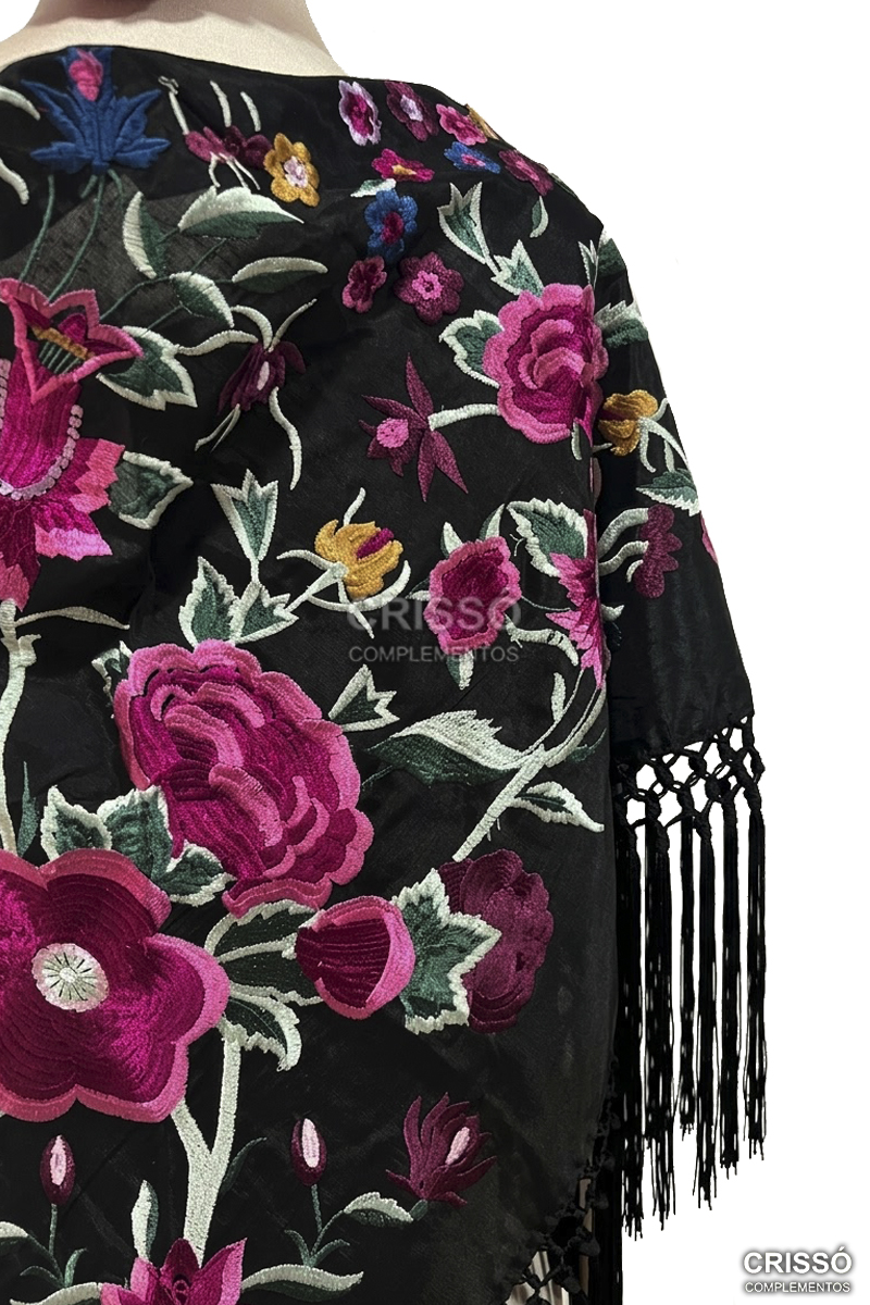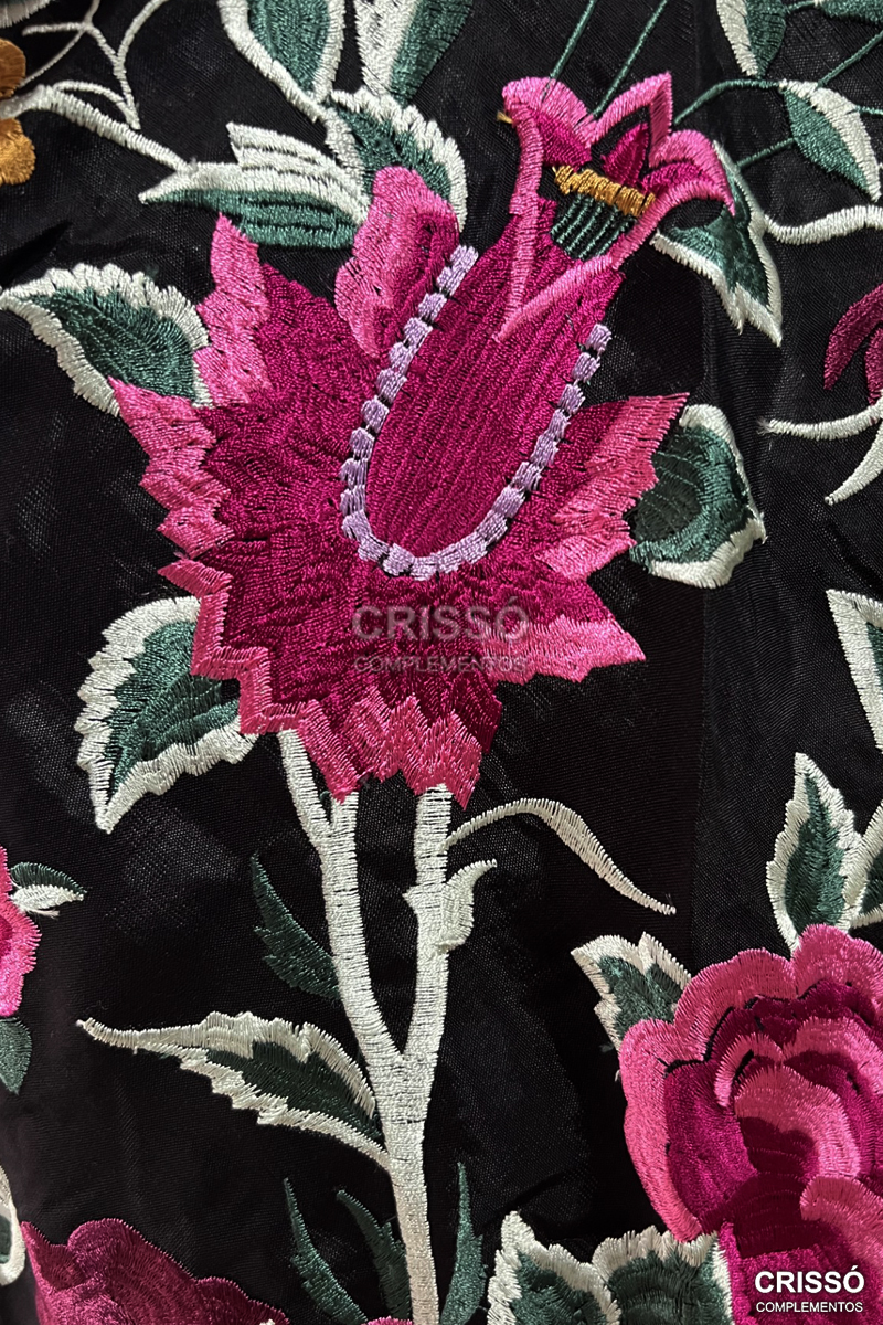 Mantón de seda bordado con motivos florales. Flecado a mano en seda.