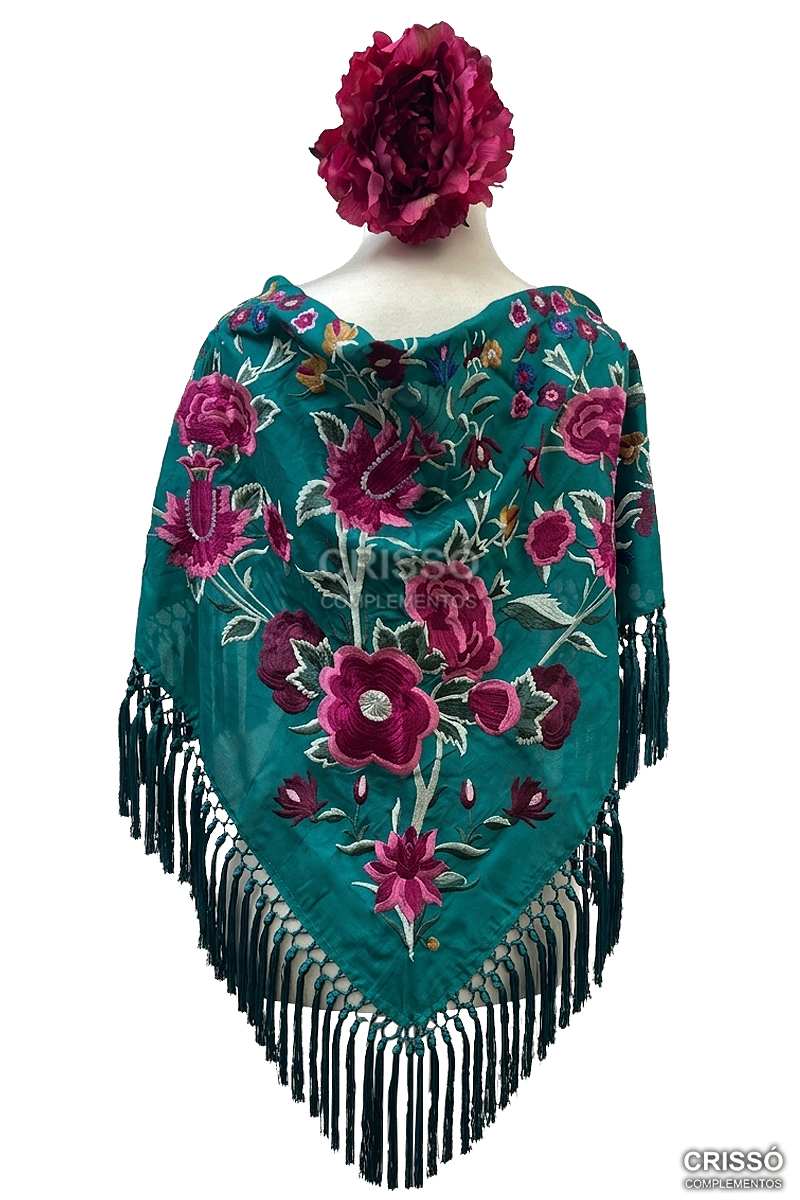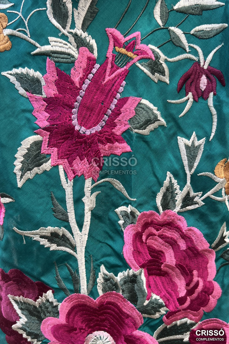 Mantón de seda bordado con motivos florales. Flecado a mano en seda.