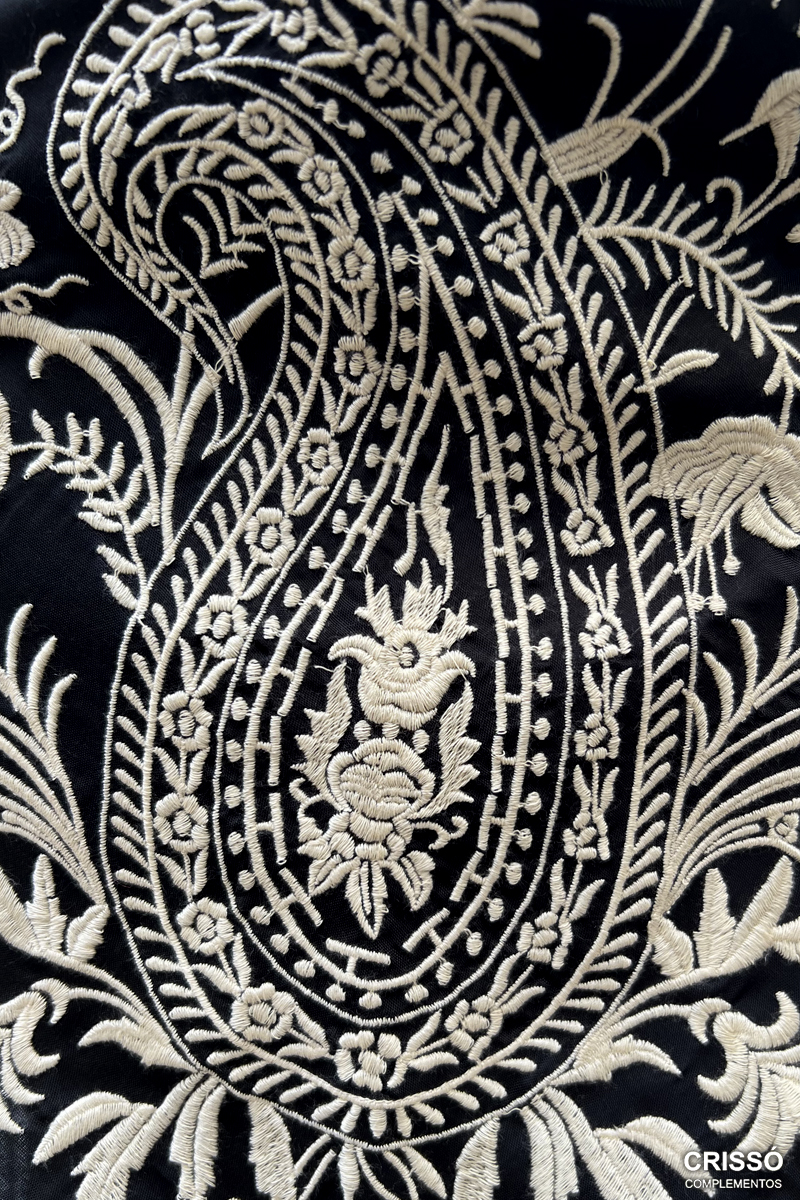 Mantón de seda bordado en hilo de algodón con motivos florales y de cachemir. Flecado a mano en seda.