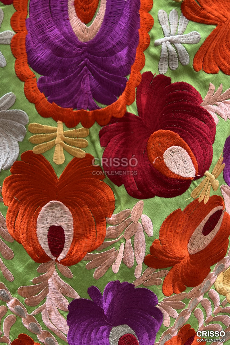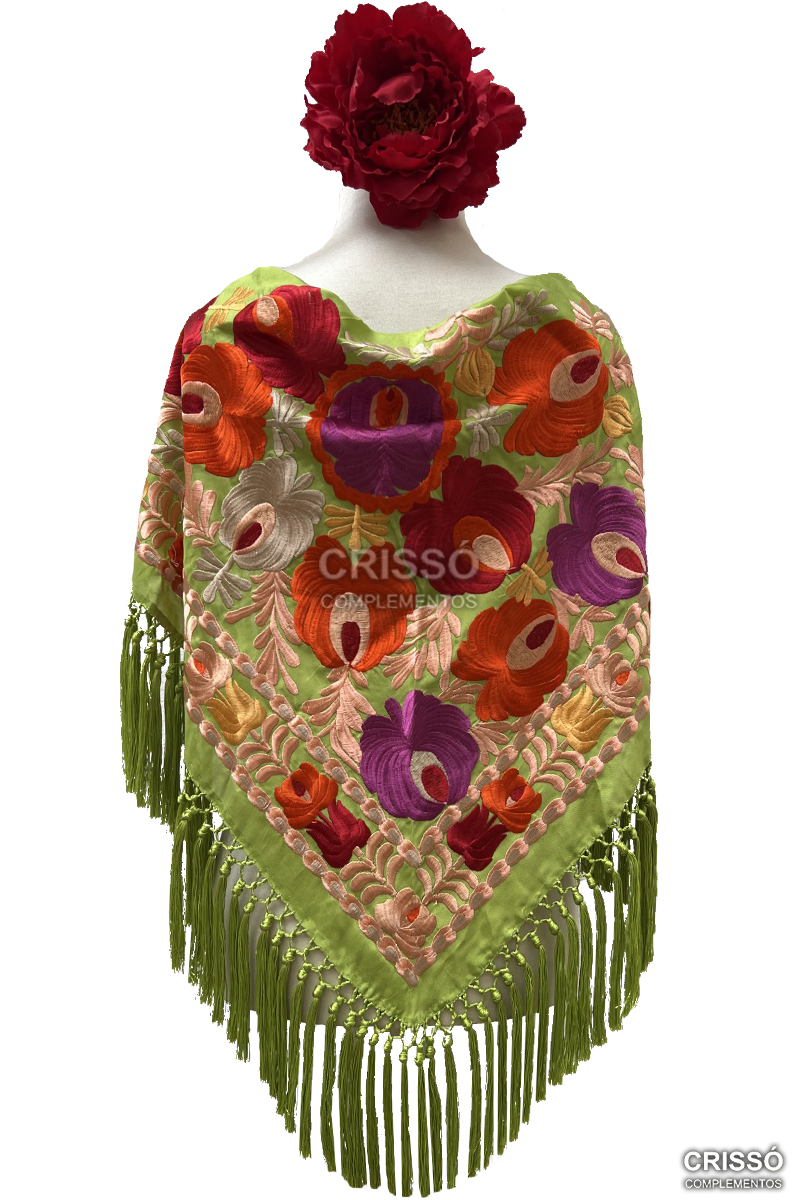 Mantón de seda bordado con motivos florales. Flecado a mano en seda.