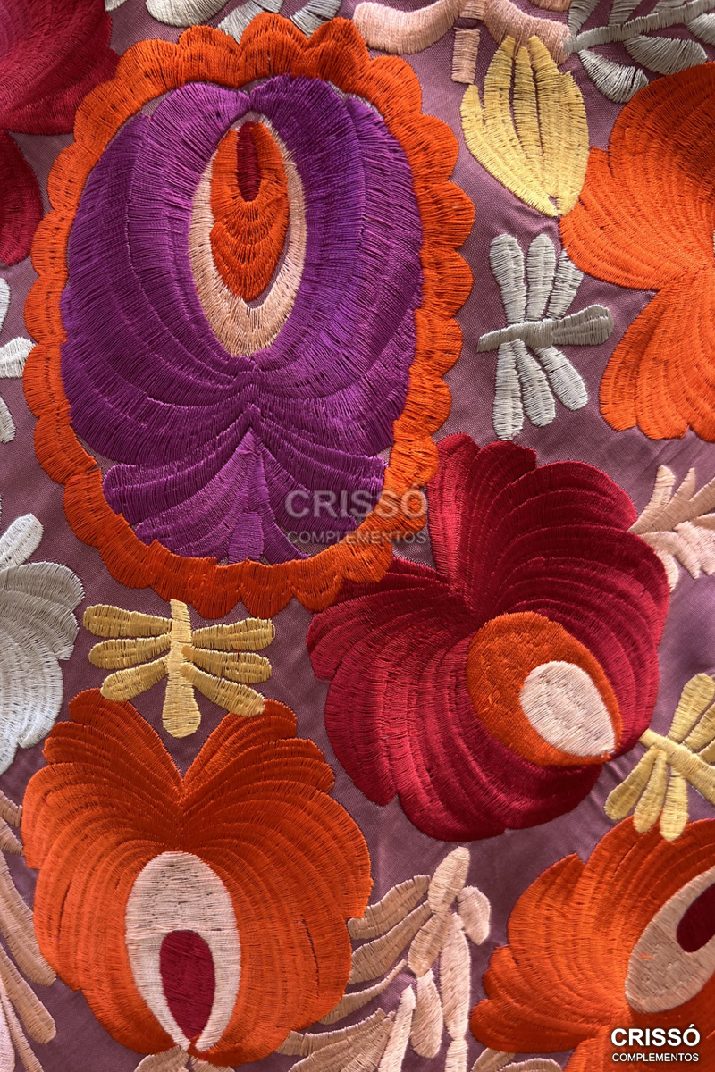 Mantón de seda bordado con motivos florales. Flecado a mano en seda.