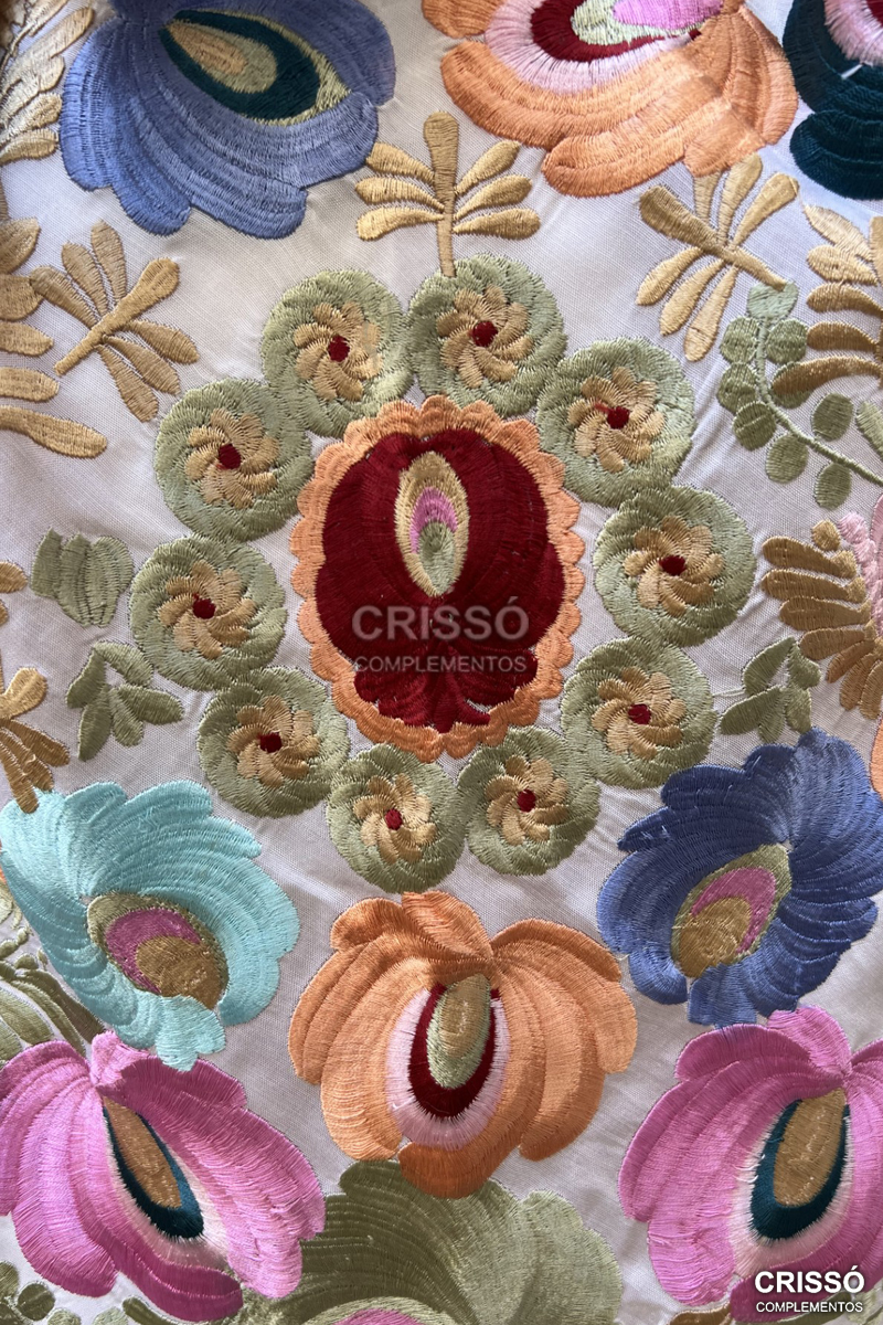 Mantón de seda bordado en hilo de seda con motivos florales. Flecado a mano en seda.