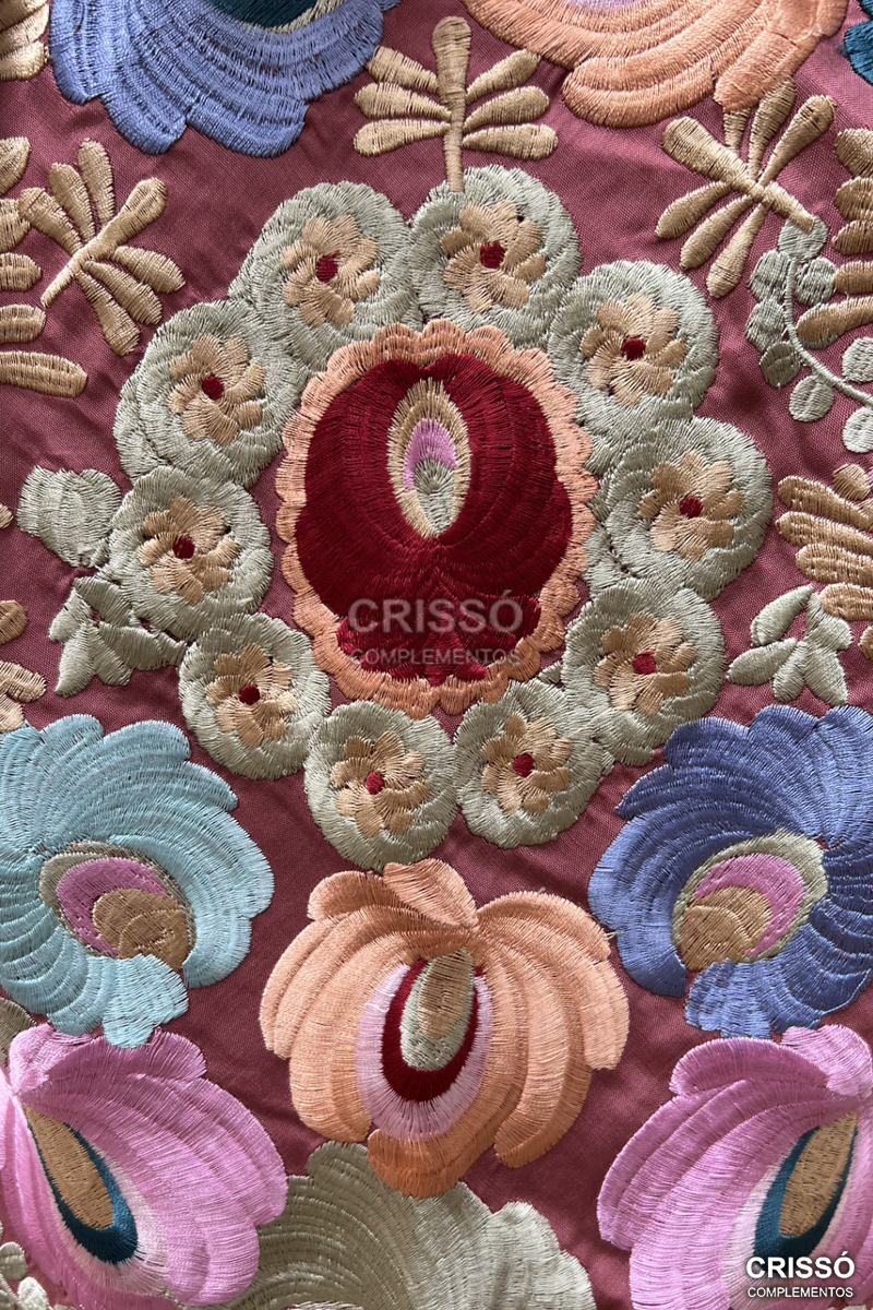 Mantón de seda bordado en seda con motivos florales. Flecado a mano en seda.