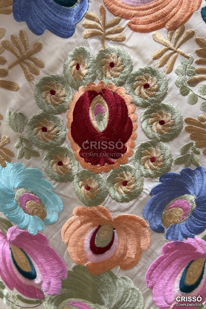 Mantón de seda bordado con motivos florales. Flecado a mano en seda.