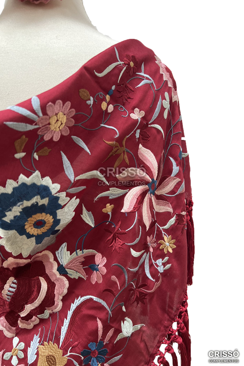 Mantón de seda bordado en hilo de seda con motivos florales. Flecado a mano en seda.