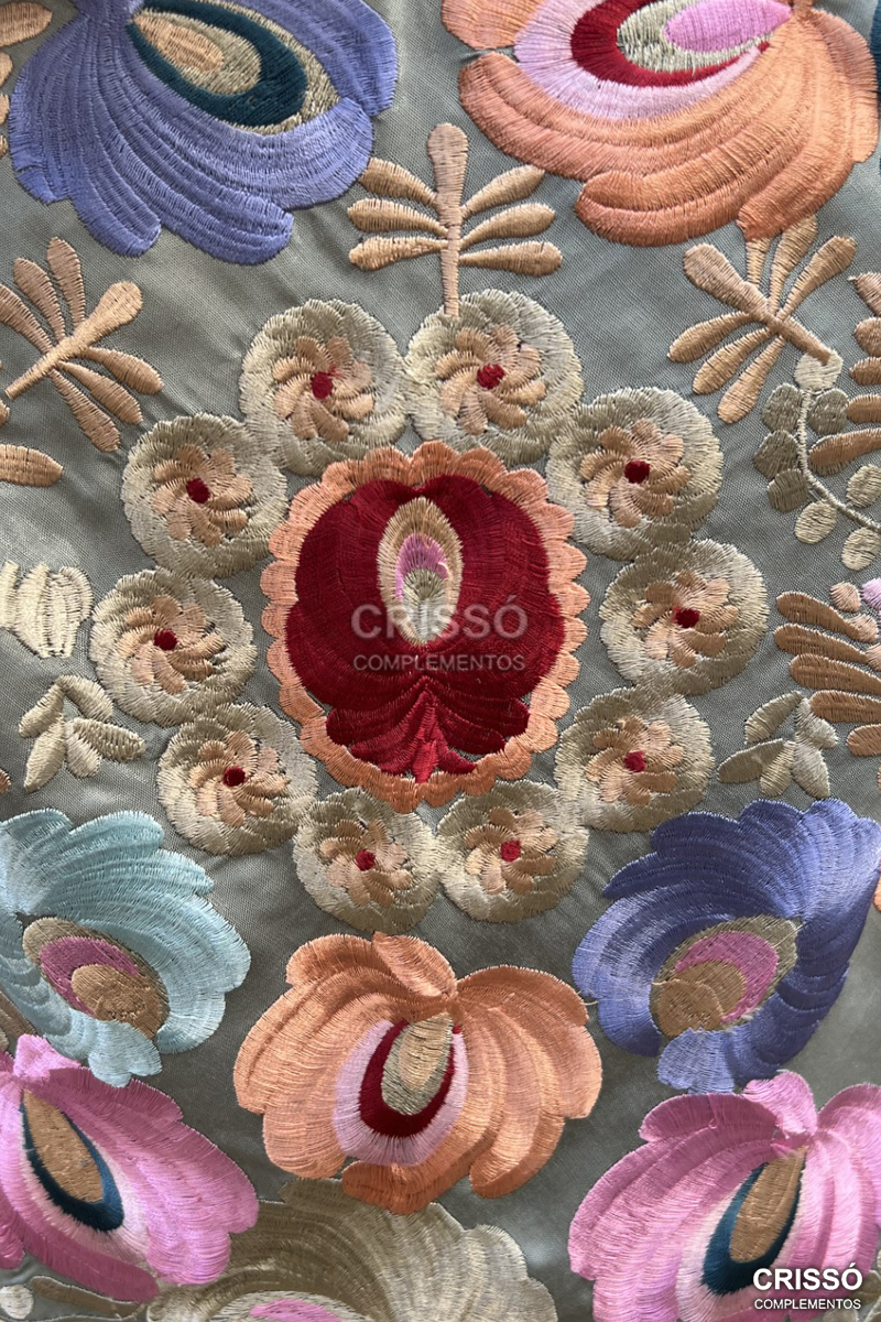 Mantón de seda bordado en hilo de seda con motivos florales. Flecado a mano en seda.
